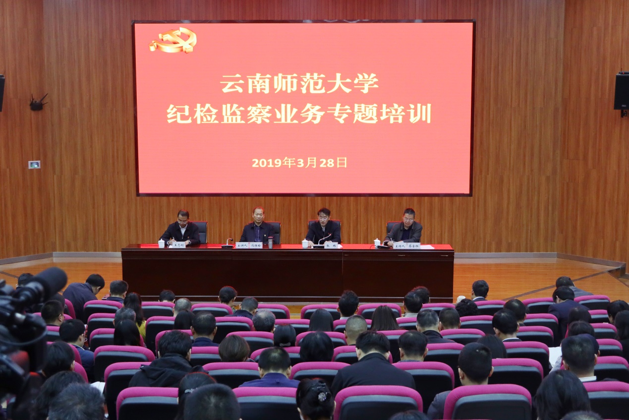 为贯彻党的十九大精神,十九届中央纪委三次全会、省纪委十届四次全会、2019年教育系统全面从严治党工作视频会议精神,省委第八巡视组反馈意见,3月28日我校在呈贡校区汇学2幢101报告厅举行2019年伟德国际1946bv官网纪检监察业务专题培训。校党委副书记张玮、校纪委书记王志刚、校纪委委员、各单位各部门主要负责人、二级单位纪检委员、特约监督员,校纪委办·监审处、云南省纪检监察干部培训基地工作人员以及云南纪检监察学院部分学生共400余人参加。