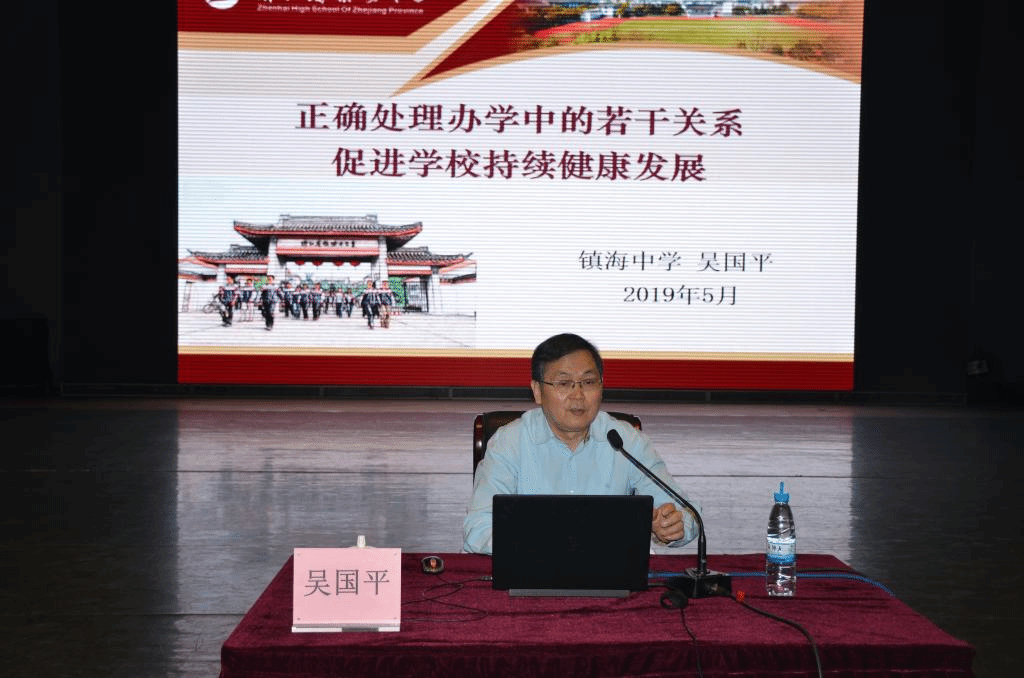 吴国平校长为学员们介绍了镇海中学的基本情况,从建校开始到他接管时,学校最大的遗憾是没有获得过国家级的奖励、学生没有得过国际奥赛的奖项,而就在吴校长正式接管镇海中学四年后便弥补了这两大遗憾,也让镇海中学一举成名,这些成绩完全得益于正确处理办学中的若干关系,即继承与创新、外部与内在、人与物、决策与执行、规范与个性、教育理想与教育现实、政治与教育等七个主要关系。