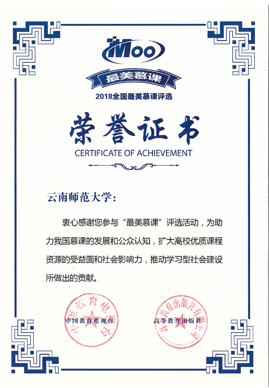 2018年11月,中国教育电视台和高等教育出版社联合策划推出“最美慕课—首届中国大学慕课精彩100评选展播活动”,全国百所高校的1850门课程参评。奖项评选通过学习数据分析、课程评价、专家评审等程序,从课程内容、教学设计、制作效果等多维度对申报课程的质量、创新性、适用性等方面进行评审,经过两个多月的激烈角逐,最终评出100门“最美慕课”。