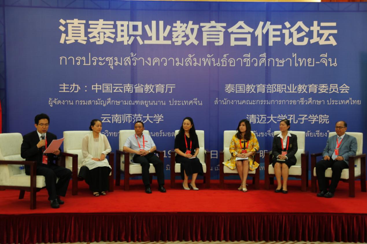 论坛第二阶段是由云南华文学院王秀成院长主持的嘉宾访谈、互动部分,泰国洛坤职业学院校长宋鹏,泰国清迈皇家大学校长帕潘·图马柴,泰国博仁大学副校长帕塔南·派查春,云南经济伟德国际victor1946董事长杨红卫,云南经贸外事职业学院院长周翔,我校职业技术教育学院副院长杨吉化作为嘉宾参与访谈。六位嘉宾依次介绍了各自学校和学院的基本状况及办学成果,分享了宝贵的办学经验,并明确表示对于滇泰职业教育合作的决心和信心,为主动融入“一带一路”建设,发挥职业教育支撑产业优势,服务滇泰经济社会发展,各自奉献一份力量。论坛最后,主持人王秀成院长对此分论坛作简要总结并宣布论坛取得圆满成功。