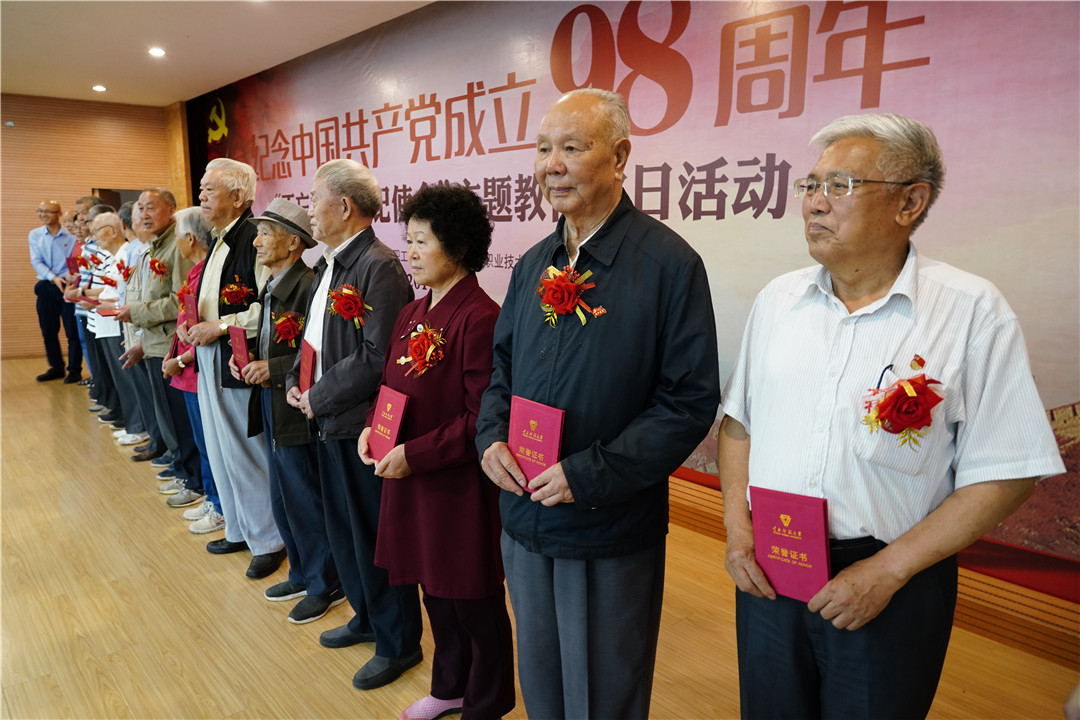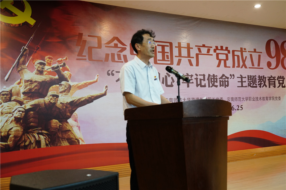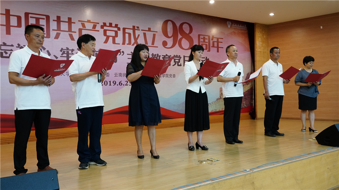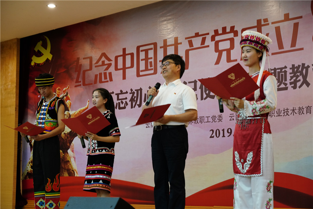 为庆祝中国共产党成立九十八周年,离退休教职工党委与职业技术教育学院党委于2019年6月25日下午,在一二一联大校区田家炳教育书院二楼报告厅联合举办“不忘初心、牢记使命”主题教育党日活动。伟德国际1946bv官网党委副书记张玮同志,云南省委老干部局政治待遇处魏晓东同志,学校老领导,组织部、宣传部、学生处、一二一联大校区管委会、保卫处、职业技术教育学院等单位负责人,老党员、青年学生党员共250人参加了此次活动。活动由“表彰先进”和“颂歌献给党”两个部分组成,分别由离退休教职工党委书记王琼玲同志、周林老师和职业技术教育学院学生王梦雅主持。