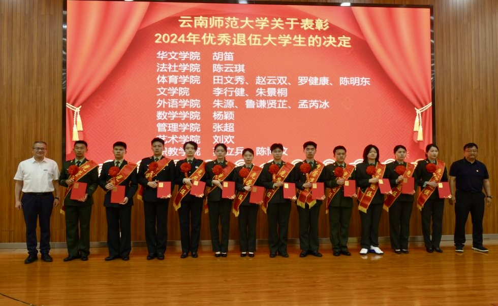 为总结年度征兵工作成效,激励青年学子投身国防事业,高质量完成2025年度征兵工作,4月28日下午,我校在呈贡主校区汇学楼报告厅举行2024年征兵工作总结暨2025年征兵动员会。校党委书记张祖武,党委副书记和雪莲,副校长甘健侯、陈正权,学校征兵工作领导小组成员单位主要负责人,各学院(学部)党委书记、副书记、辅导员,全体退伍复学学生及各学院(学部)学生代表参加活动。