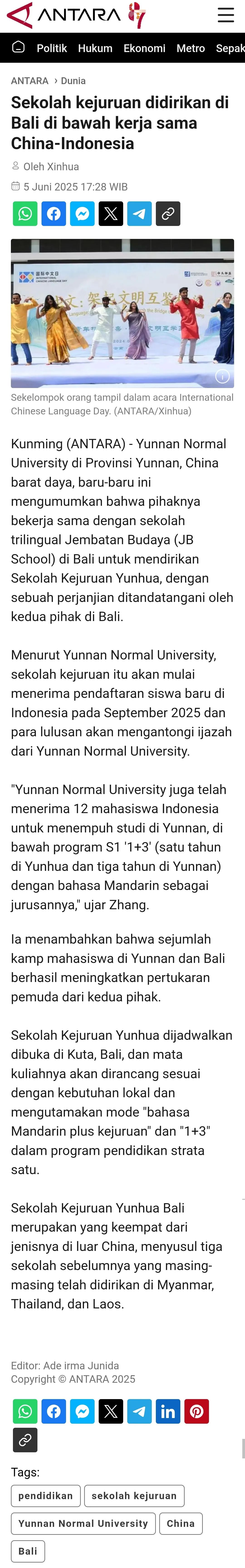 2025年6月5日,ANTARA(印度尼西亚安塔拉通讯社)对我校与印度尼西亚巴厘省文桥三语学校共建“印尼云华职业学院”进行了报道。