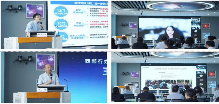 地理学部主任陈光杰介绍了地理学一流学科专业建设的现状及未来发展规划,提出我校在推动西部地理科学教育改革方面的具体思路。清迈大学社会科学学部副部长Dr. Chanida Suwanprasit介绍了清迈大学与我校地理科学专业的合作现状及未来规划。智慧树网副总裁王健介绍了“慕课西部行-智慧西行”项目的整体实施情况,展示了先进数字技术在地理教学中的应用成效。