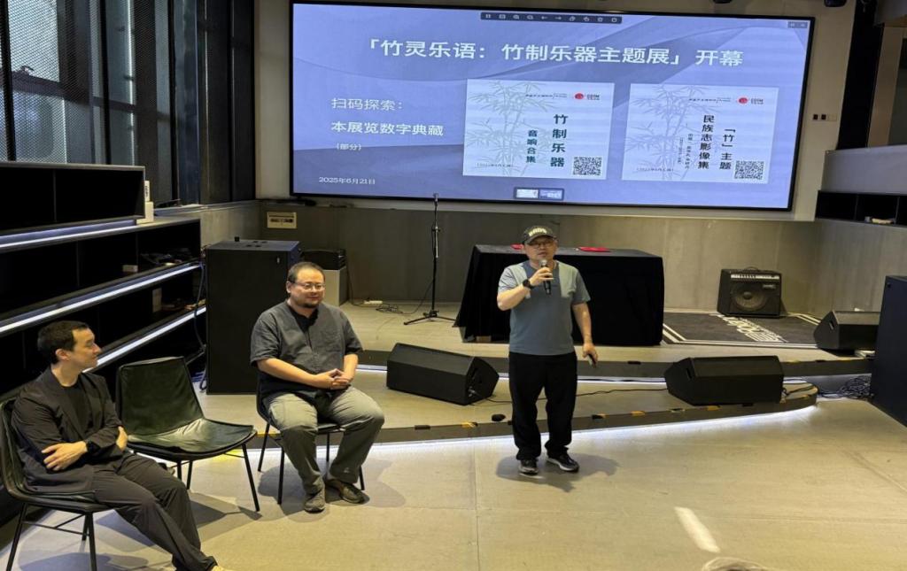 本次展览展示了杨琛教授团队田野考察收集的竹制乐器及珍贵音频,在策展、学术、体验三个维度实现创新,体现了艺术学院在民族音乐研究、文化遗产展示与传播方面的前沿理念和实践能力。6月21日,在展览开幕式上,声音艺术博物馆联合创始人秦思源先生与杨琛教授共同为观众导览;研讨会环节,云南大学陈学礼教授分享了竹文化影像志实践经验,并与秦思源先生、杨琛教授、魏小石博士就竹乐器与音乐文化的传播与现场观众展开交流,国家级非物质文化遗产四川金钱板“邹派”传承人向雪飞进行了现场演出。