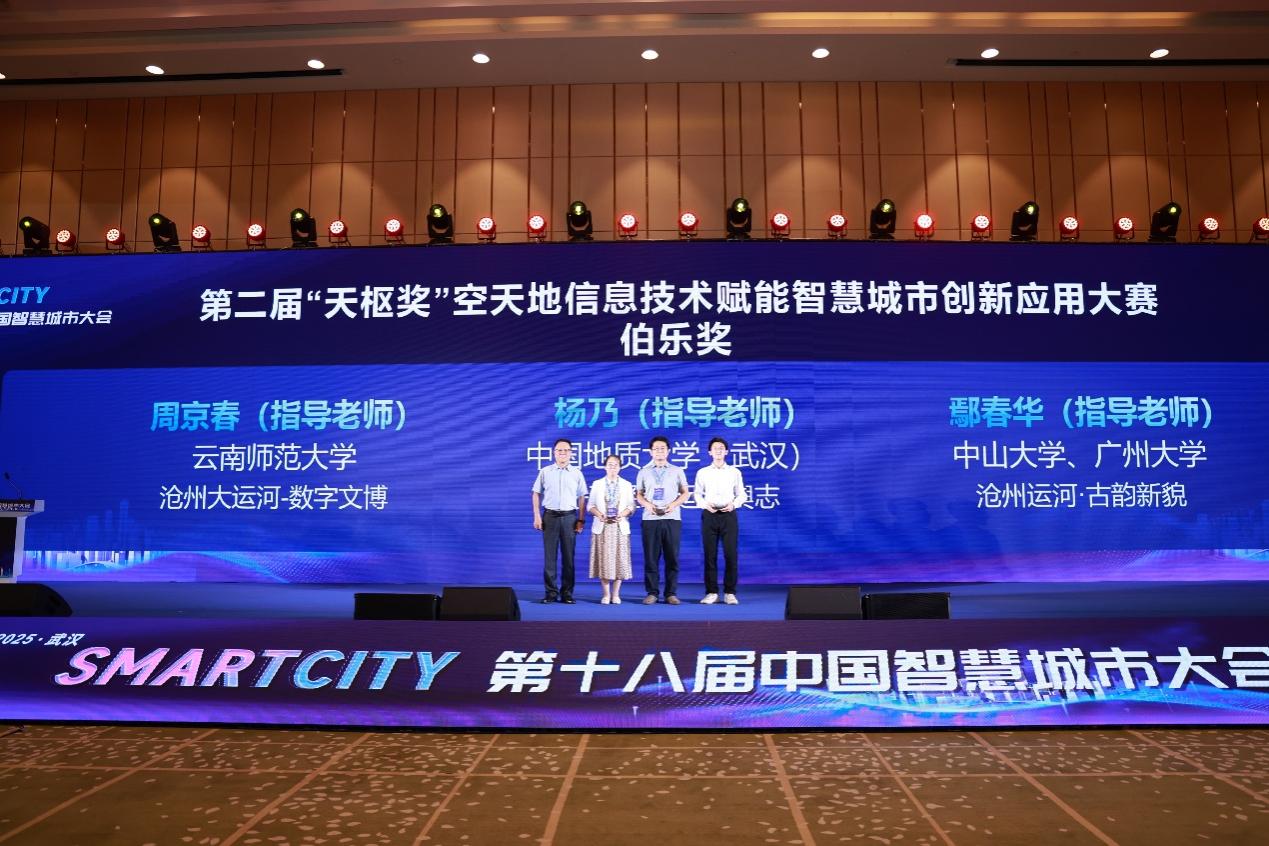 6月26日至28日,第二届空天地信息技术赋能智慧城市创新应用大赛在武汉举行。我校地理学部本硕学生团队提交的“千年运河沧州记忆”数字文博作品获大赛最高奖项“天枢奖”,指导教师周京春教授获“伯乐奖”。
