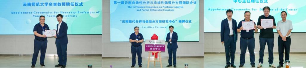 胡金明与魏军城共同为云南现代分析与偏微分方程研究中心揭牌。胡金明为魏军城颁发学校名誉教授证书和中心名誉主任聘书,为Manuel delPino颁发中心学术委员会主任聘书。