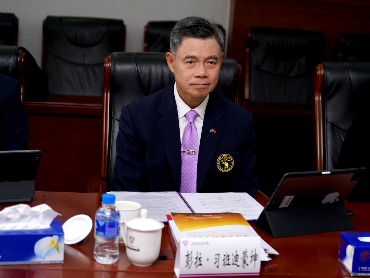 胡金明在致辞中表示,中泰友谊源远流长、历久弥新。今年恰逢中泰建交50周年,两国合作持续深化,为两校进一步密切各领域合作、实现共赢发展提供了新的机遇,奠定了更加坚实的基础。在“中泰一家亲”新时代大背景下、在两校的密切配合下,清迈孔院教育质量稳步提升、服务能力不断增强,各项工作迈上了新的台阶。希望双方继续保持密切合作、深化交往交流,聚焦汉语教学和推广、“中文+职业”教育、中泰双语医疗人才等重点领域,不断深化协同创新,加快推进孔子学院工作高质量发展。进一步将清迈大学孔子学院打造成为两校之间全方位交流合作的平台,为两校事业发展和影响力提升创造更多的机遇,为构建更为稳定、更加繁荣、更可持续的中泰命运共同体做出新的贡献。胡金明介绍了我校参与建设全球教师发展学院的相关情况,并邀请清迈大学共同推进后续教师培养与培训项目。