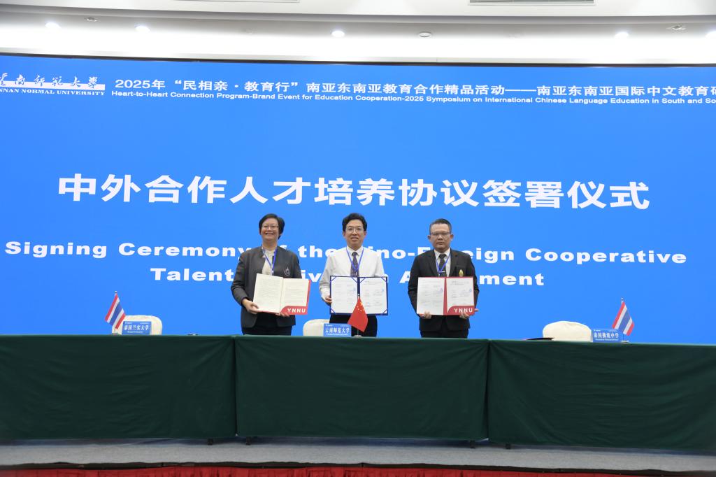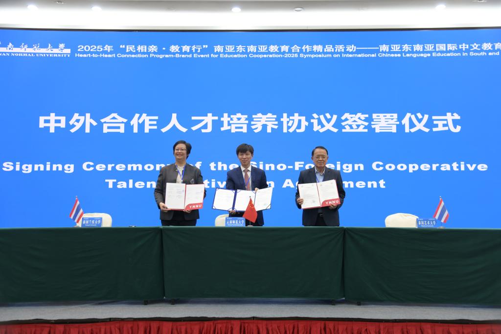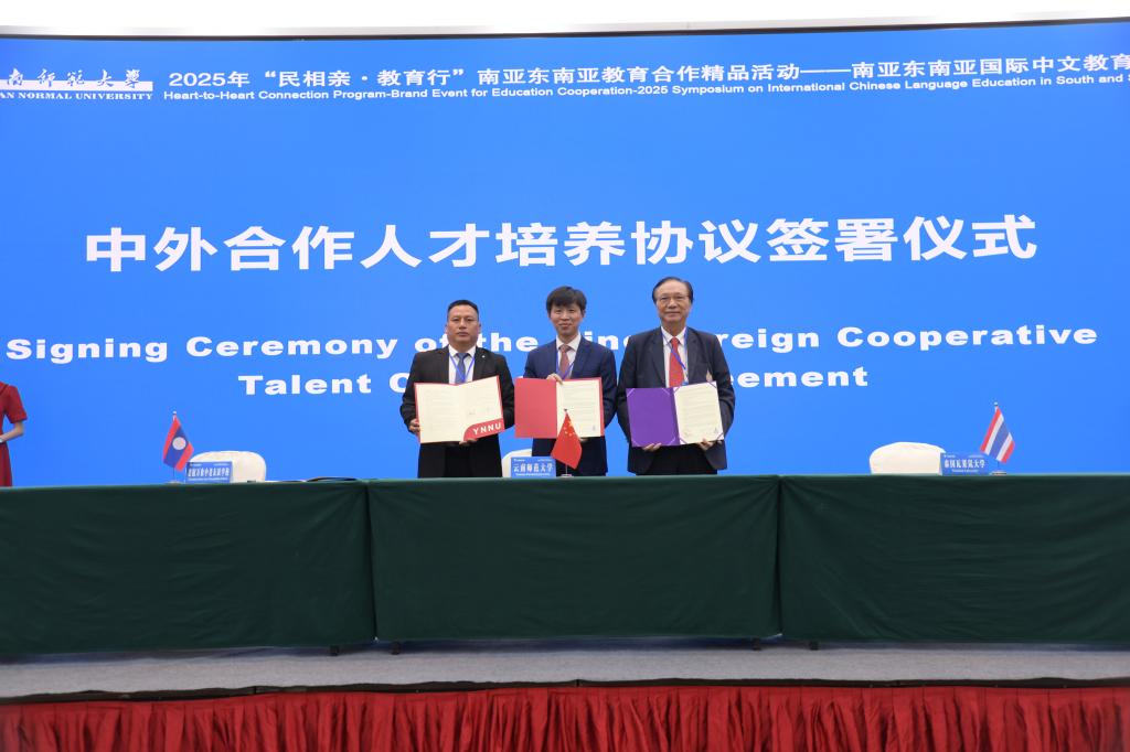 在与会人员的共同见证下,胡金明与泰国瓦莱岚大学校长颂巴·探玛荣塔尼亚翁、老挝中老友谊中学校长许顺宏签署合作协议,与泰国兰实大学文学院院长潘心媛、泰国艺术大学教育学院院长卡尼·克约维猜交换签署合作协议文本。王秀成与泰国兰实大学文学院院长潘心媛、泰国佛统中学校长沙差瓦·辛哈通签署具体项目合作协议。
