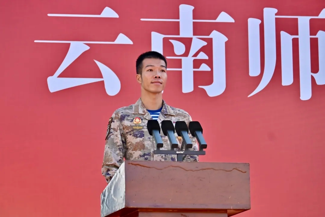 体育学院参加九三阅兵的宁明东同学现场回顾了自己六个多月的阅兵训练经历。“当我站在阅兵场上,接受党和人民的检阅时,不禁热泪盈眶。我为曾是一名中国军人而骄傲,为生活在这个伟大时代而庆幸,为身为云师学子而自豪!”他动情地说道。宁明东鼓励学弟学妹们珍惜时光、脚踏实地,以“阅兵标准”严格要求自己,走好脚下的每一步,始终怀抱家国情怀,以所学所能回馈社会、建设国家。
