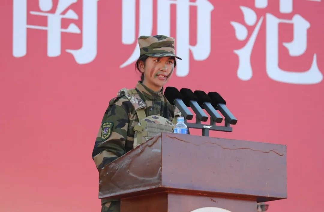 艺术学院李姗作为优秀学员代表发言,回顾了21天难忘的军训时光,表达对全体教官、老师及工作人员的感谢。她表示,在今后的学习道路上会保持高昂的斗志,把军训收获的坚毅和耐力,转化为克服困难的信心与勇气。“作为新时代的青年,我们应当继承和发扬爱国主义精神,以勤奋好奇之心钻研学业,以青春之我、奋斗之我,不忘初心、砥砺前行,为实现中华民族伟大复兴贡献自己的力量!”