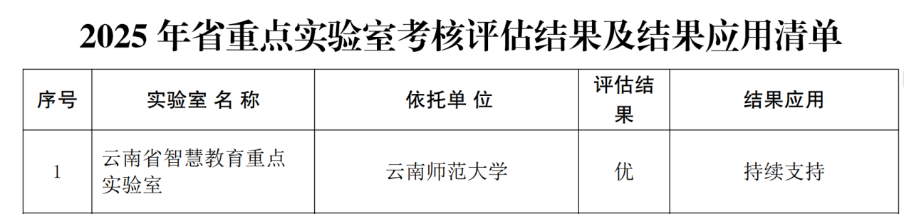 近日,云南省科技厅公布了2025年度云南省重点实验室评估结果,由我校甘健侯教授牵头负责的“云南省智慧教育重点实验室”获评“优秀”等次。云南省重点实验室是全省科技创新体系的重要组成部分,是开展高水平基础与应用基础研究、促进学科发展、汇聚和培养优秀科技人才、深化国内外学术交流、推动先进资源开放共享的重要平台。此次评估中,我校首次跻身云南省重点实验室“优秀”行列,标志着学校在科研平台建设与管理上取得重要突破,也充分体现了实验室的综合实力及其对云南智慧教育发展的坚实支撑。