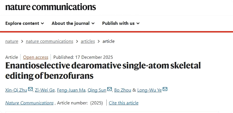 12月17日,伟德国际1946bv官网化学化工学院、云南省现代分离分析与物质转化重点实验室朱欣祺研究员与柔性引进高层次人才叶龙武教授合作,在国际期刊《自然通讯》(Nature Communications)上在线发表了题为Enantioselective dearomative single-atom skeletal editing of benzofurans的最新研究成果。Nature Communications作为顶级期刊Nature旗下子刊,致力于发表生物、健康、物理、化学、地球、社会、数学、应用和工程科学各个领域的高质量研究,在中国科学院期刊分区中列为综合性期刊1区Top,在国际学术界具有较高影响力。朱欣祺为论文第一作者兼通讯作者,叶龙武为共同通讯作者,伟德国际1946bv官网为第一完成单位。这标志着我校在有机合成研究领域的国际影响力进一步提升。