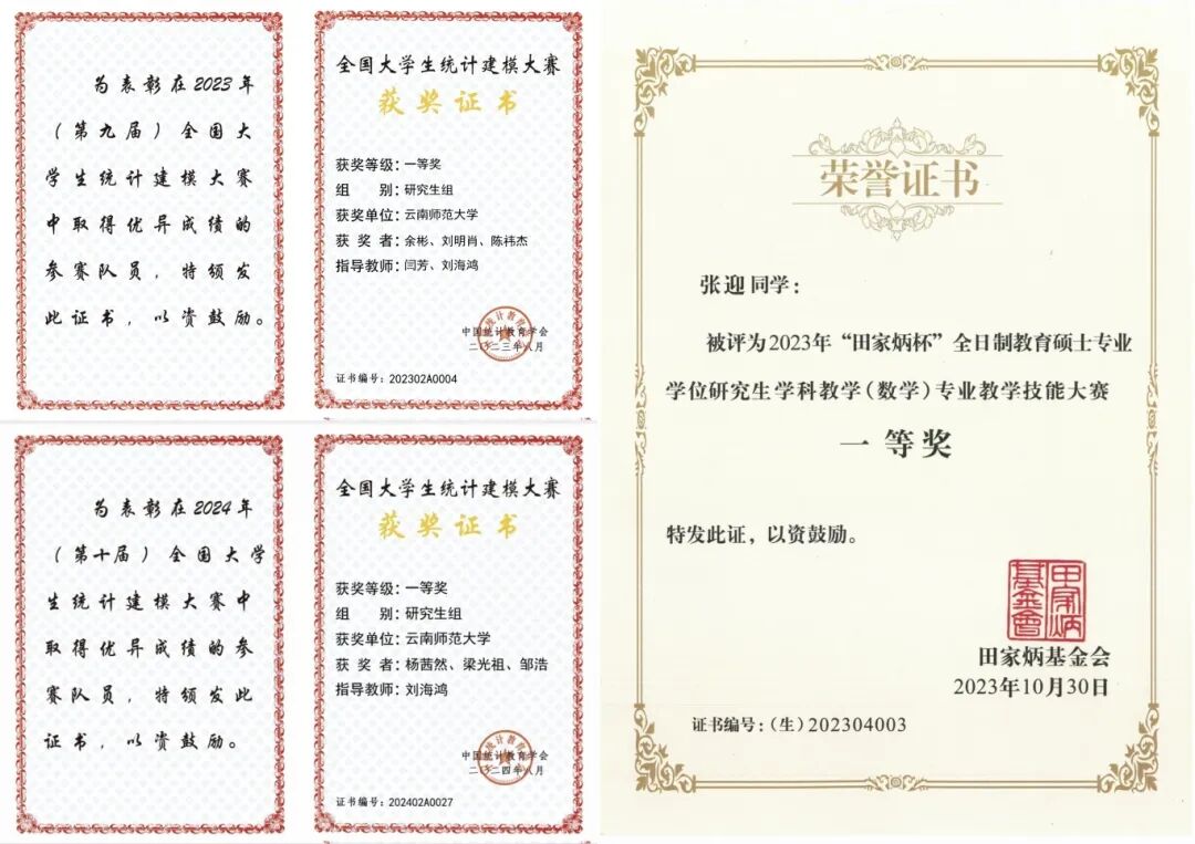 研究生教育实现高质量发展。每年录取硕士研究生100人以上,五年共培养硕士研究生418人,28人赴国内外高校攻读博士学位。研究生发表高质量学术论文54篇,主持省教育厅科研基金17项;获“田家炳杯”教育硕士教学技能大赛12项,“华为杯”研究生数学建模竞赛国家三等奖10项,“华文杯”全国师范生教学技能大赛一等奖26项,全国大学生统计建模大赛18项;“正大杯”第十三届全国大学生市场调查与分析大赛17项。毕业生赴国内外高校和科研院所攻读博士学位28人,参加国际交流并做学术报告14人。教师出版教材4部,获批2项云南省研究生优质课程建设项目、2个云南省研究生导师团队,获得云南省教学成果奖(研究生类)二等奖1项,校级教学成果奖一等奖1项、二等奖1项。实践育人体系不断完善,建成 3 个专业学位实践基地。