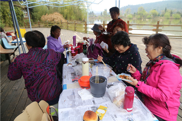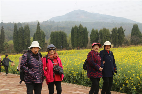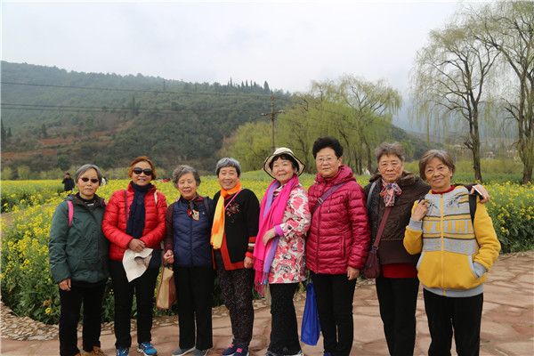 漫步于油菜花中的老同志们,闲聊着,细品春的味道。他们三五成群,时而用手机拍照,时而凑到一块共享自己带上的美食。