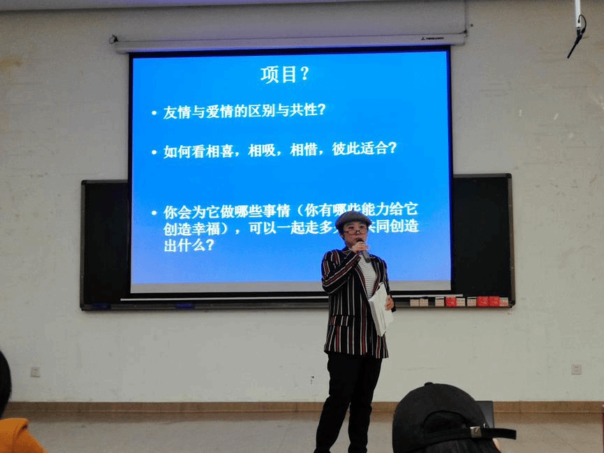 随后,大学生创业行动创业咨询辅导师刘昳国老师就“如何选择项目”进行提问,通过学生对亲情、爱情和友情的理解,浅显易懂地让学生明白了在互联网+大赛中选择项目的相关知识。刘老师以亲切的态度,多次将话筒交给同学们,了解同学们的切身体会,并给予了同学们鼓励和指导。