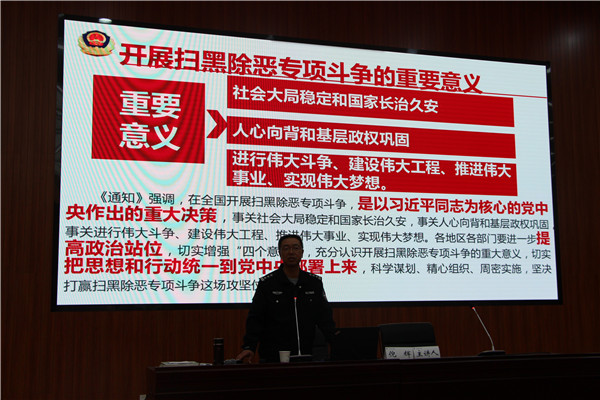 吴家营派出所民警倪辉为大家作了题为“积极检举揭发黑恶犯罪,警民联手促进社会和谐”的报告。他强调,在全国开展扫黑除恶专项斗争,是以习近平同志为核心的党中央作出的重大决策,事关社会大局稳定和国家长治久安,事关人心向背和基层政权巩固,事关进行伟大斗争、建设伟大工程、推进伟大事业、实现伟大梦想,各地区各部门要进一步提高政治站位,切实增强“四个意识”,充分认识开展扫黑除恶专项斗争的重大意义,切实把思想和行动统一到党中央部署上来,科学谋划、精心组织、周密实施,坚决打赢扫黑除恶专项斗争这场攻坚仗。