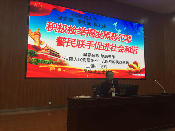 4月4日下午,我校在呈贡校区汇学2幢101报告厅举行扫黑除恶专项斗争宣讲报告会暨2019“学生安全员”培训会。校学生工作(部)处、保卫处、各学院辅导员及本科“学生安全员”近500名师生参加了宣讲报告会,报告会由保卫处处长刘军主持。