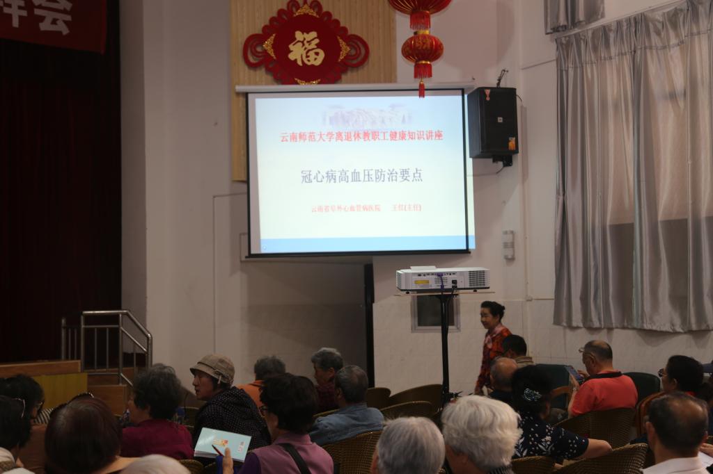 为增强我校离退休教职工的健康意识,掌握科学的保健方法,提高身体素质和晚年生活质量,4月18日下午,离退休工作处特邀云南省阜外心血管病医院七病区主任王红教授到我校一二一西南联大校区离退休教职工西院活动中心作“冠心病高血压防治要点”的健康知识讲座,共有120余人参加。