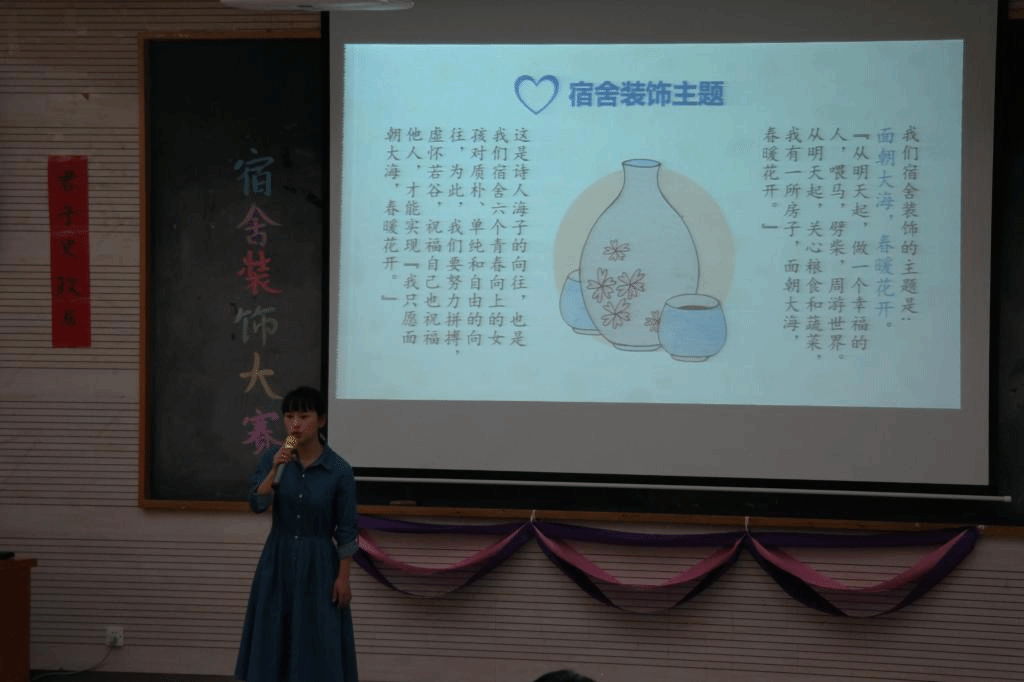 进入决赛的宿舍准备充分、幽默风趣的讲解一次次把赛场的气氛点燃,精彩纷呈。大家主题各异,有名为“小确幸”、“独家记忆”等宿舍的温馨婉约;也有名为“星馨屋”的简约爽朗以及名为“隰有荷”的古朴典雅。“芳华岁月”宿舍以一曲《棠梨煎雪》拉开了讲解的序幕,他们或是生活中遇到的困难,亦或是宿舍聚餐的温馨,还是比赛获奖的欢乐,都让我们认识到了一个团结、温馨、积极向上的6栋361。“北纬贰贰柒”宿舍的讲解幽默大气,结合视频和PPT展示,通过宿舍的成员简介、宿舍生活的照片、宿舍学习成果等方面的展示,很好的诠释了温暖、阳光、积极、乐观的宿舍文化。