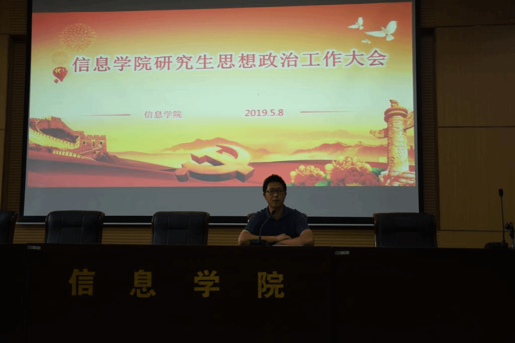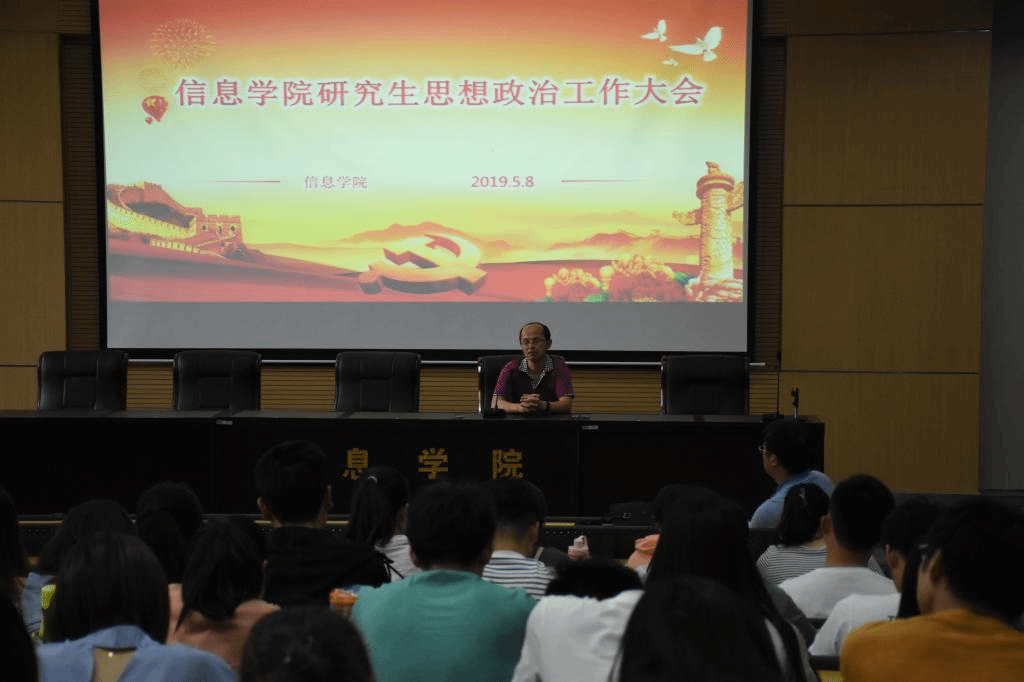 为加强研究生思想政治建设,强化研究生日常教育管理,信息学院于2019年5月9日在睿智4号楼111报告厅召开了研究生思想政治工作会。学院党委书记冷天玖老师、党委副书记刘德鹏老师、分管研究生工作的副院长云利军老师、研究生教学秘书张春节老师、研究生辅导员谭密老师和全院研究生参加此次会议。会议由党委副书记刘德鹏主持。