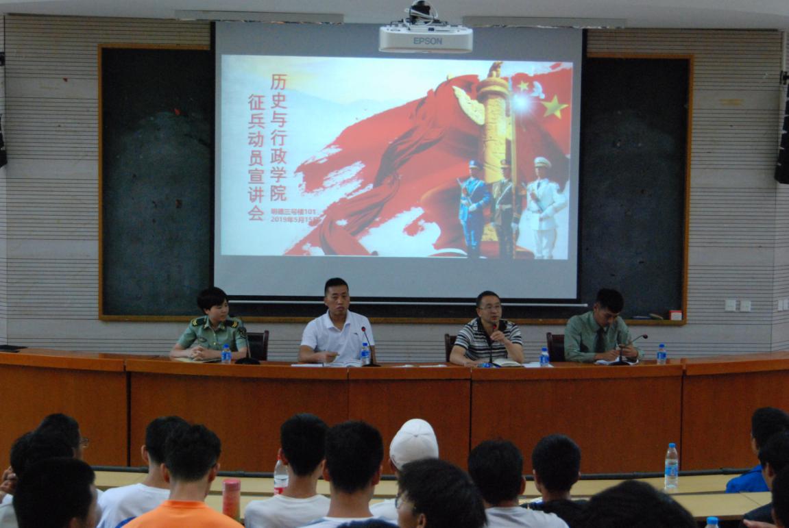 为稳步推进大学生征兵各项工作落实,5月16日下午,历史与行政学院在明德3号楼101报告厅开展征兵宣讲活动。学院党委副书记朱欢勋老师、团委书记周鹏老师及学院全体男生参加了本次征兵动员宣讲会。会议由朱欢勋副书记主持。