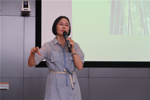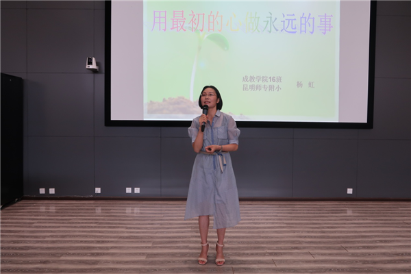 杨虹副校长系昆明市级学科带头人,一级教师,昆明市级优秀班主任,省级优课名师,陈洁名师工作室核心成员,全国特级教师管建刚的徒弟。在作文教育方面有深入的研究,其作文教学《吹泡泡》获全国一等奖,在全国网络平台开展过《情绪写作,让学生获得写作的快感》,多篇论文获奖和发表在省级期刊上。杨虹副校长以“用最初的心做永远的事”为主题,以个人成长历程为主线,将自己20余年的教学经历划分为四个阶段:“说说刚入职的五年——回顾六年的初中教学生涯——谈谈十年的教育教学成长——聊聊三年教学管理体验”,通过分享告诉在场同学们,在步入工作岗位后,在一个新的环境中,不能随波逐流,要通过不间断的学习,才能挣脱环境的藩篱。