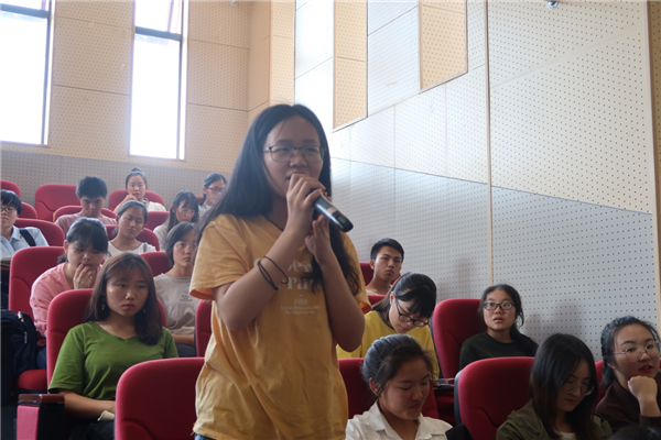最后,进入到现场提问环节,在场学生分别结合自己的专业特色和个人定位、怎样当一名好老师等提问,杨虹副校长一一作答,现场互动良好,气氛活跃,掌声雷动。在活动结束之际,杨虹副校长再次告诫同学们,要成为一名优秀教师,需要良好的专业素养,需要与人交往和团队协作能力,需要教育的韧劲,需要不停的记录和反思,还需要具备教育的创新能力,这样就能完成教师成长四部曲:“合格”——“一般”——“优秀”——“卓越”。最后,她寄语在场同学:“相信世界上美好的事都是由美好的人创造的,从明天起做一个温暖的人。”