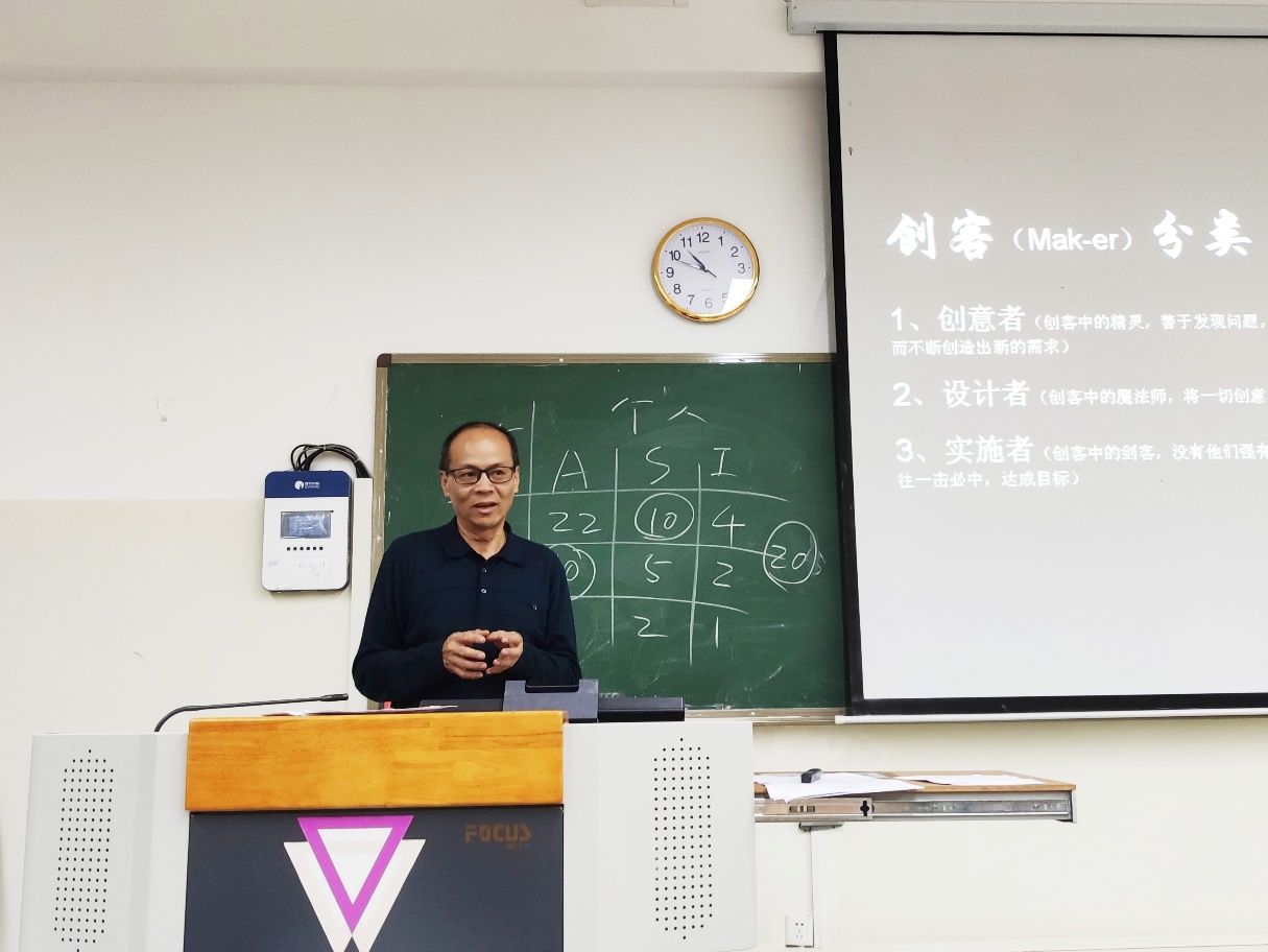 第一次课上,就业处李映松老师首先介绍首期“创客训练营”的整体情况、课程及活动内容安排、考核要求等,接下来他基于生涯理论、霍兰德人格类型论、创业者行为等内容对创业认知这一主题进行了分享。昆明兴滇科技孵化器总经理钟健文基于多年对创业项目孵化的经验,针对“创客”及“创客”文化进行了解读。
