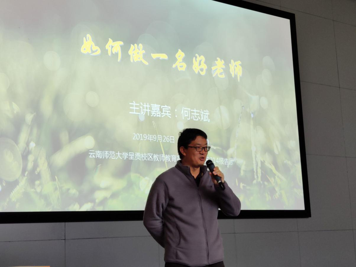 为凸显我校教师教育的办学特色,进一步加强对师范生的就业指导力度,全面提升我校师范生的综合素质和就业能力,“名师讲坛”第九期主讲嘉宾——云南省下关一中初中部开发区校区副校长、语文高级教师何志斌于9月26日在我校呈贡主校区教师教育实训大楼Ⅱ区214报告厅做主题讲座,各学院带队教师、学生代表、就业处相关工作人员共计200人参加了本次讲座。