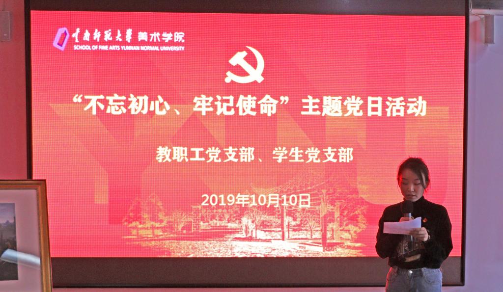 十月的校园,红色映金秋。10月10日下午,美术学院教职工党支部与学生党支部党员在学院一楼党员教育活动区,共同举行“不忘初心、牢记使命”主题党日活动。红色的国旗、红色的党史展板整齐排列,红色LED屏将整个大厅映衬得喜庆而热烈。师生党员共50余人参加了活动,活动由教职工党支部书记李雪岳老师主持。