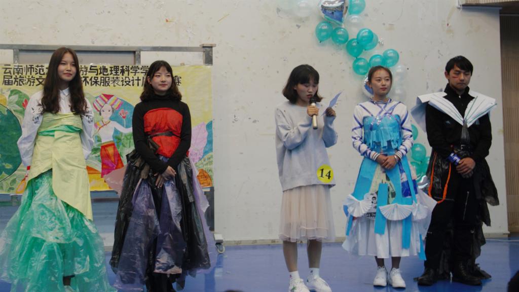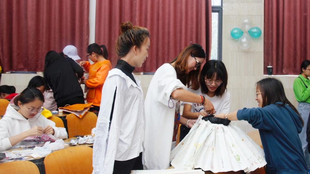比赛分为环保服装制作和展示两个环节。首先进行的是现场服饰制作环节,各组选手携带提前准备好的环保材料到现场,在一个半小时内完成比赛服饰的制作。废弃的纸板、餐盘、纸杯、雨伞,闲置的蚊帐、布料,甚至是校园里的落叶,都成为了制作材料。团结协作的参赛小组,各种新奇的创意……制作现场热火朝天而又紧张有序。