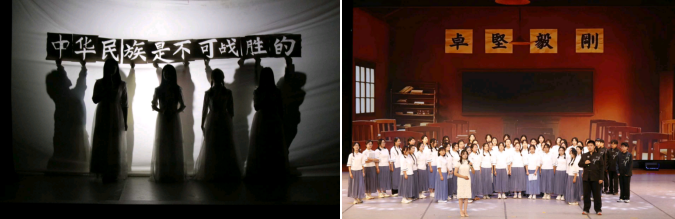 整场展演以“烽火联大”为脉络,通过多元艺术形式生动诠释爱国主义精神。朱自清班的《红歌映联大声颂中华》以红色旋律串联历史与当代,冯友兰班的诗朗诵《人民万岁》讴歌人民伟力,沈从文班的《烽火弦歌薪火相传》重现教育救国历程,王力班的《党的女儿》展现百年巾帼力量。国韵馆非遗艺术研习社的京剧《红灯记》彰显革命信仰传承,闻一多班的诗歌朗诵传递炽热爱国情怀,罗庸班的《青春中国》以集体朗诵再现了革命年代的理想与壮志,曹愚话剧社的《山河还记得》演绎先烈不朽功绩,冯至班的《山河》构建跨越时空的青春对话,罗常培班的《永远的思念》,抒发了对革命先辈的无限追思与崇高敬意,游国恩班的影子剧《小兵张嘎》塑造少年英雄形象,唐兰班的《烽火里的中国》则展现民族血脉的永恒延续。