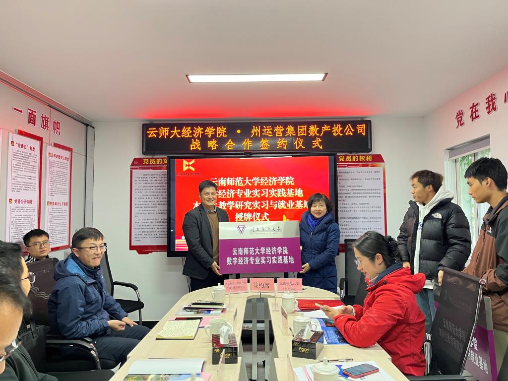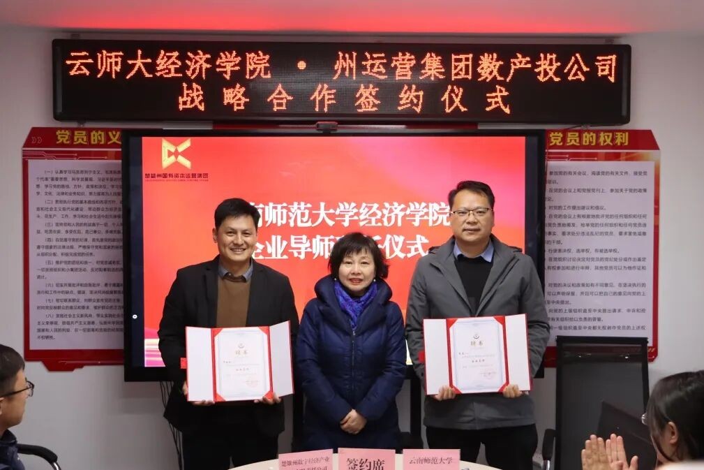 11月19日,经济学院与楚雄州数字经济产业投资有限责任公司在楚雄市举行战略合作签约暨授牌仪式。经济学院党委书记杨栋会、数字经济专业负责人陈晔婷、金融专业负责人曹文婷,楚雄州国有资本运营集团有限公司纪委书记陈建禄,楚雄州数字经济产业投资有限责任公司董事长毕皓云、总经理李逵等相关负责人参加。
