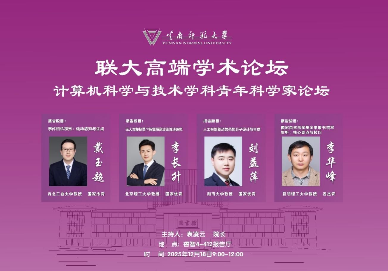 12月18日,信息学院举办了“联大高端学术论坛暨计算机科学与技术学科青年科学家论坛”。论坛邀请西北工业大学教授戴玉超、北京理工大学教授李长升、湖南大学教授刘益萍和昆明理工大学教授李华锋作报告,科技处领导、信息学院党政领导、学院骨干教师和学生代表参加论坛。
