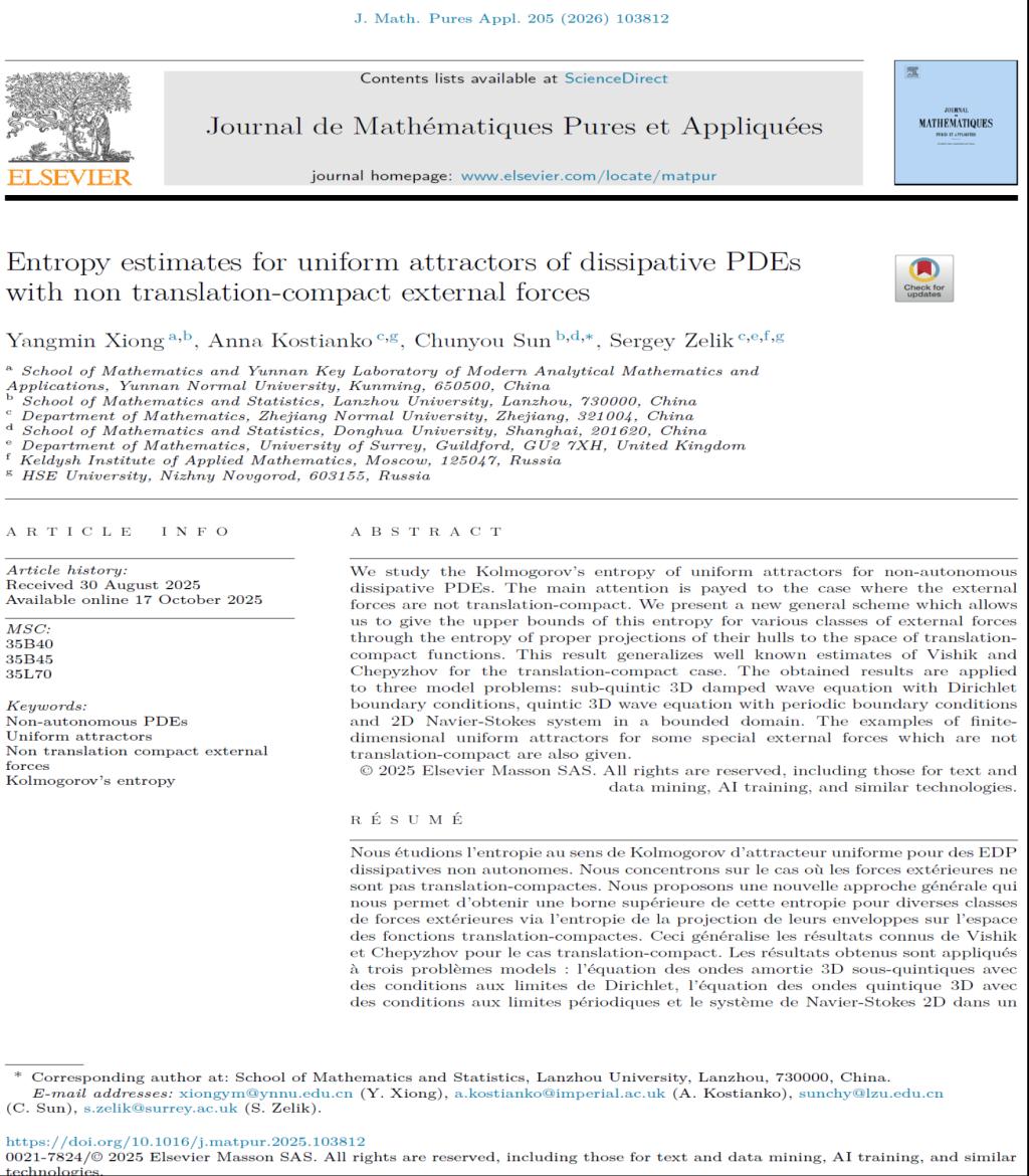 数学学院熊杨敏博士与乌克兰Anna Kostianko教授,兰州大学,东华大学孙春友教授,以及英国Sergey Zelik教授合作,在国际数学领域公认的权威期刊《Journal de Mathématiques Pures et Appliquées》发表题为“Entropy estimates for uniform attractors of dissipative PDEs with non translation-compact external forces” 的研究论文。该成果在非自治耗散动力系统的一致吸引子理论方面取得重要突破。