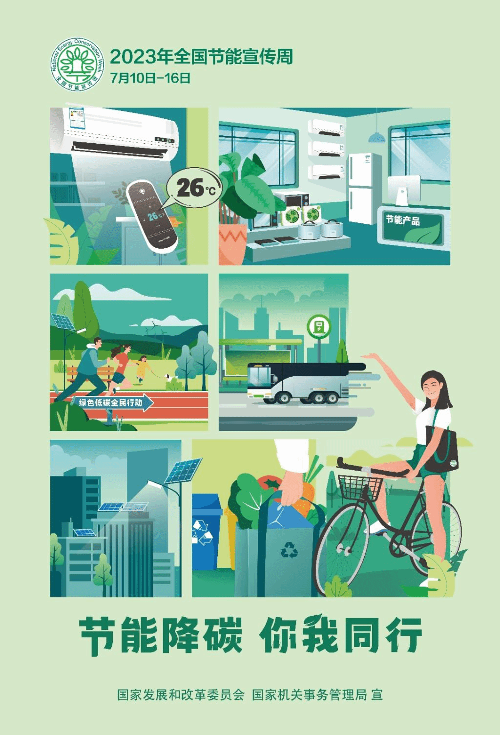 2023年全囯节能宣传周为7月10日至16日,主题是 “节能降碳,你我同行” ;全国低碳日为7月12日,主题是 “积极应对气候变化,推动绿色低碳发展”。