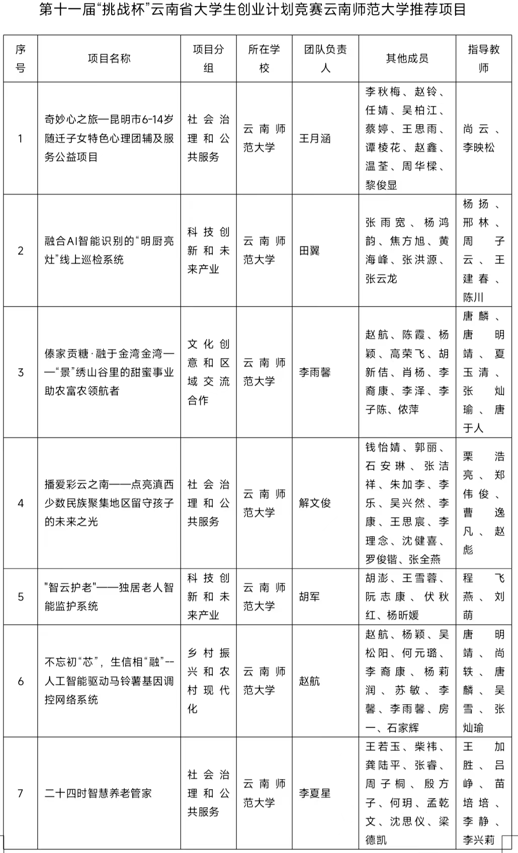 根据《关于举办第十一届“挑战杯”云南省大学生创业计划竞赛实施方案的预通知》要求,现对我校推荐项目进行公示,详见附件1。