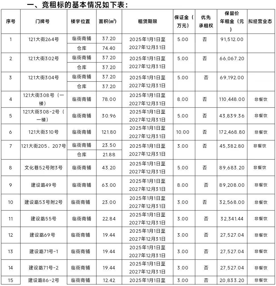 3.如竞租人在此次招租前已经是本次招租范围内所含铺面的承租人,须缴清所有租金、水电等相关费用方可参与本项目;