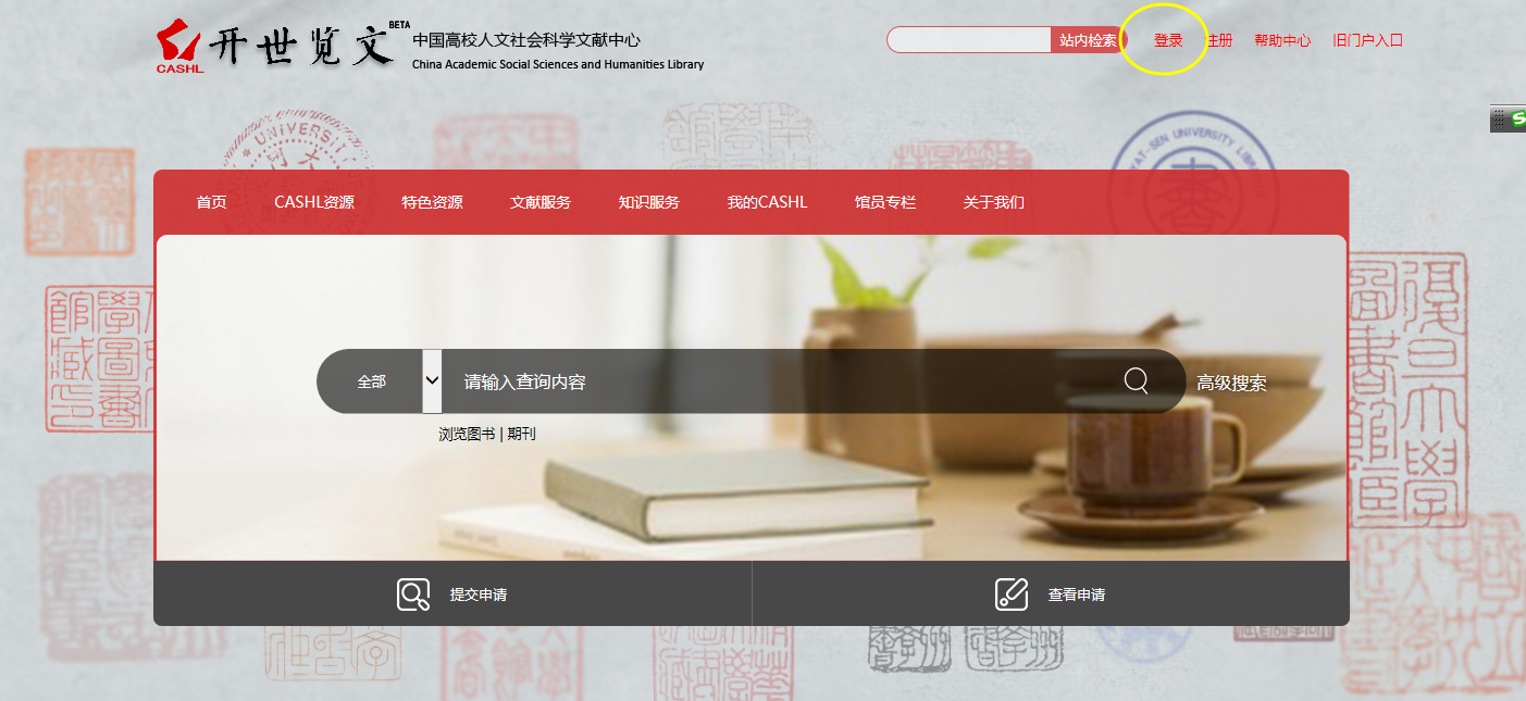 3、检索文献,提交文献传递申请。CASHL主页可以检索3类文献资源,即图书、期刊和文章。在检索框中输入检索词,点击检索框右边的一个类似于放大镜的按钮即可检索文献。