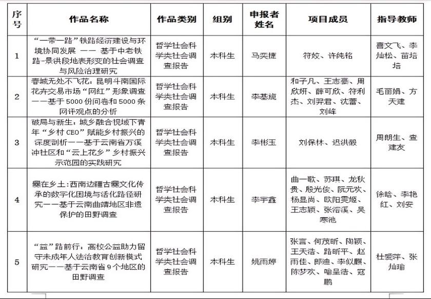 根据云南省第十三届“挑战杯”大学生课外学术科技作品竞赛相关工作安排,经自主申报、学院(学部)推荐、专家两轮评审,拟推荐《“行走的思政课”视域下西南联大爱国主义教育现状及实践创新对策分析》等15个作品参加省级竞赛。现将拟推荐项目名单公示如下: