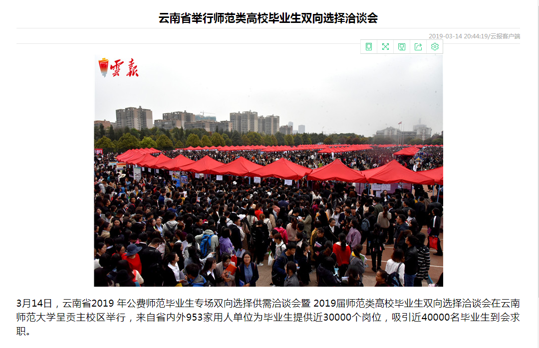 上一条:云南网 2019-03-15 近四万毕业生挤爆云南省师范类高校毕业生双选会 下一条:云广新闻 2019-03-14 四万人齐聚云师大,只为这场全省规模最大的双选招聘会