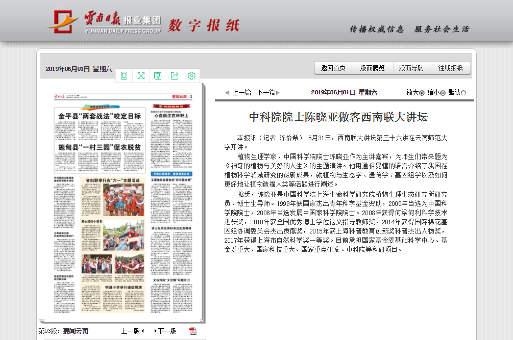 上一条:中新网 2019-05-31 中科院院士陈晓亚做客伟德国际1946bv官网西南联大讲坛 下一条:云南网 2019-05-31 陈晓亚院士做客西南联大讲坛 分享“神奇的植物与美好的人生”