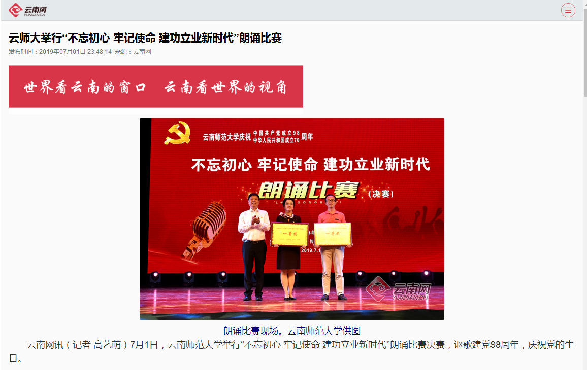 上一条:春城晚报 2019-07-02 云师大举行“不忘初心、牢记使命,建功立业新时代”朗诵比赛 下一条:学习强国 2019-06-02 我校美术学院教师马祥和 人民日报文章《提升书法艺术人文精神》