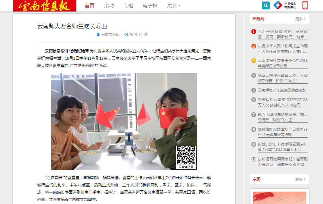 上一条:云广新闻 2019-10-02 云师大师生与祖国同频共振 同祝祖国繁荣昌盛 下一条:春城晚报 2019-10-02 我们的节日·国庆丨为伟大祖国庆生,共吃祖国生日长寿面