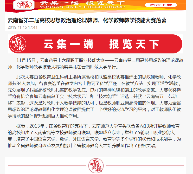 上一条:都市时报 2019-11-16 13名优秀教师荣获一等奖 下一条:春城晚报 2019-11-15 比拼教学技能,我省这些高校思想政治理论和化学教师获奖
