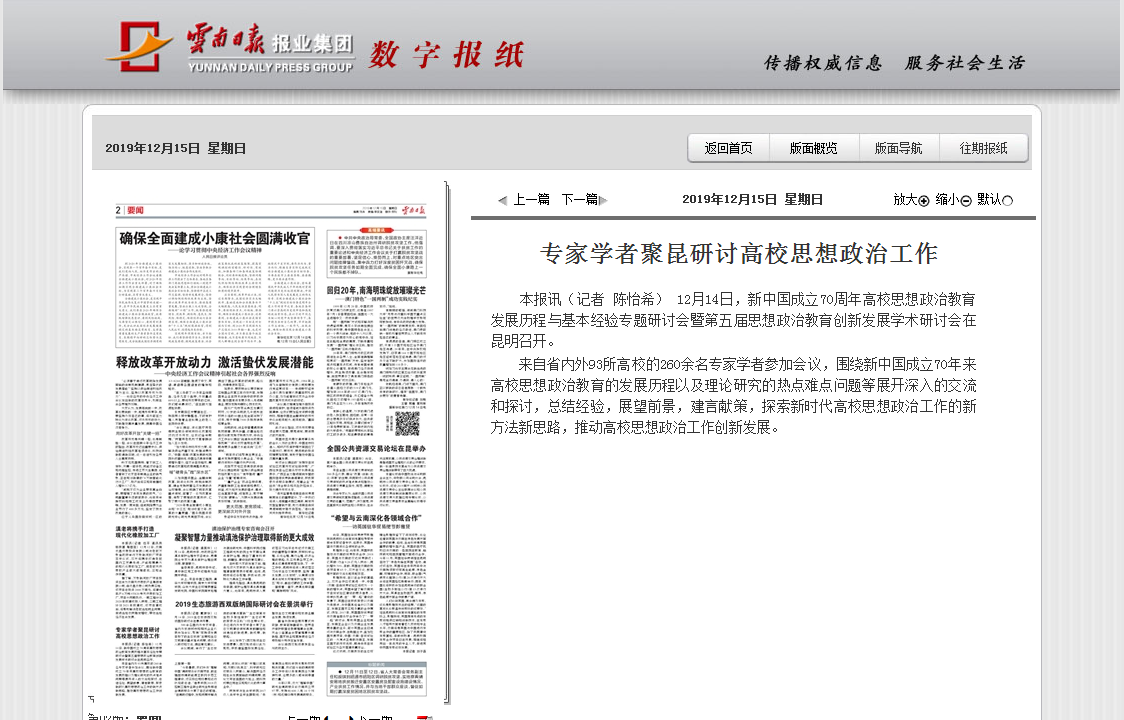 上一条:光明日报 2019-12-15 高校思政如何做 百名学者来献计 下一条:云南日报 2019-12-14 专家学者齐聚春城 探讨思想政治教育创新发展
