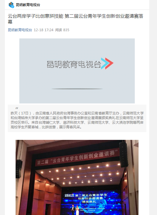 上一条:昆明教育新闻 2019-12-19 云台两岸学子比创意拼技能 第二届云台青年学生创新创业邀请赛圆满落幕 下一条:云桥网 2019-12-18 第二届云台青年创新创业赛在昆举行