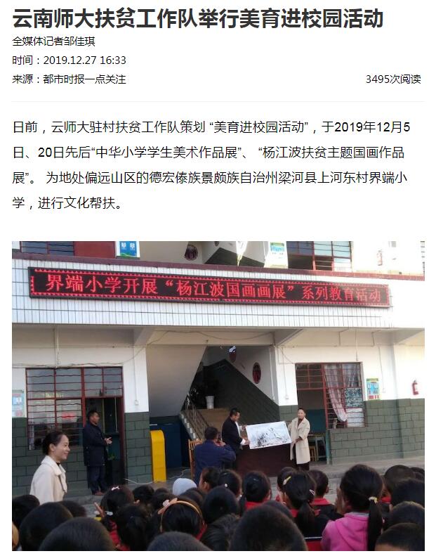 上一条:中国青年报 2019-12-30 云南师大扶贫工作队为驻村小学校举办国画展 下一条:春城晚报 2019-12-27 云师大扶贫工作队举行美育进校园活动