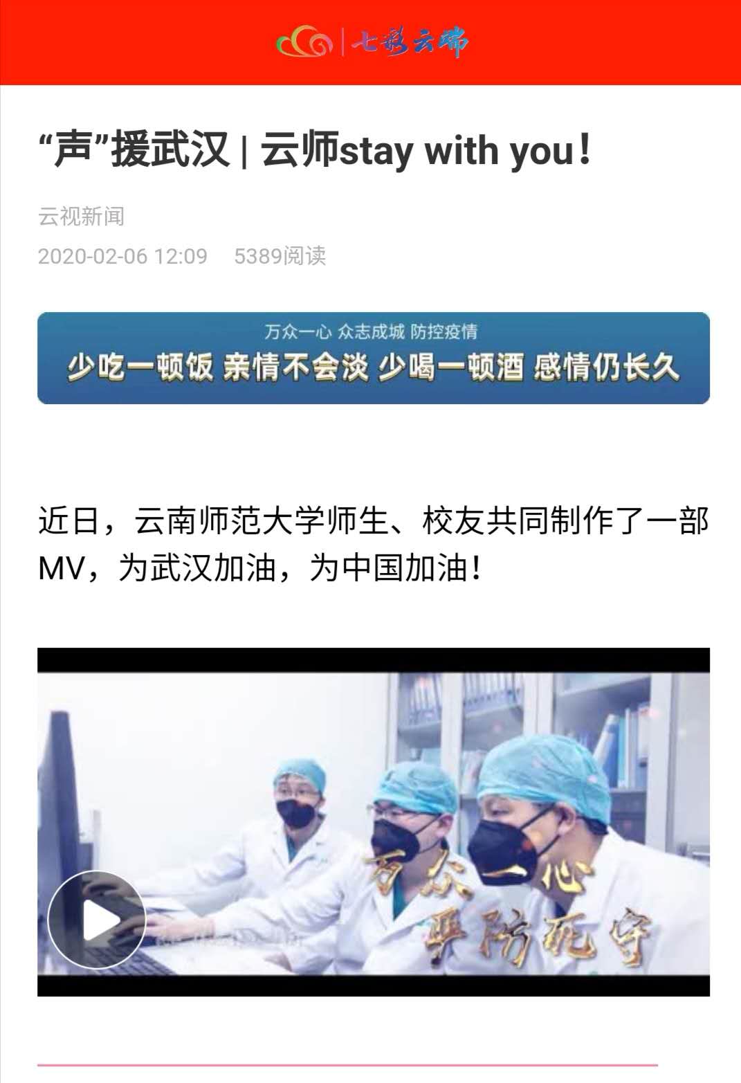 上一条:春城晚报 2020-02-07 【暖心故事】满满正能量!云师版《stay with you》为武汉加油 下一条:云南网 2020-02-06 “声”援中国 云师版《stay with you》为“疫战”加油!